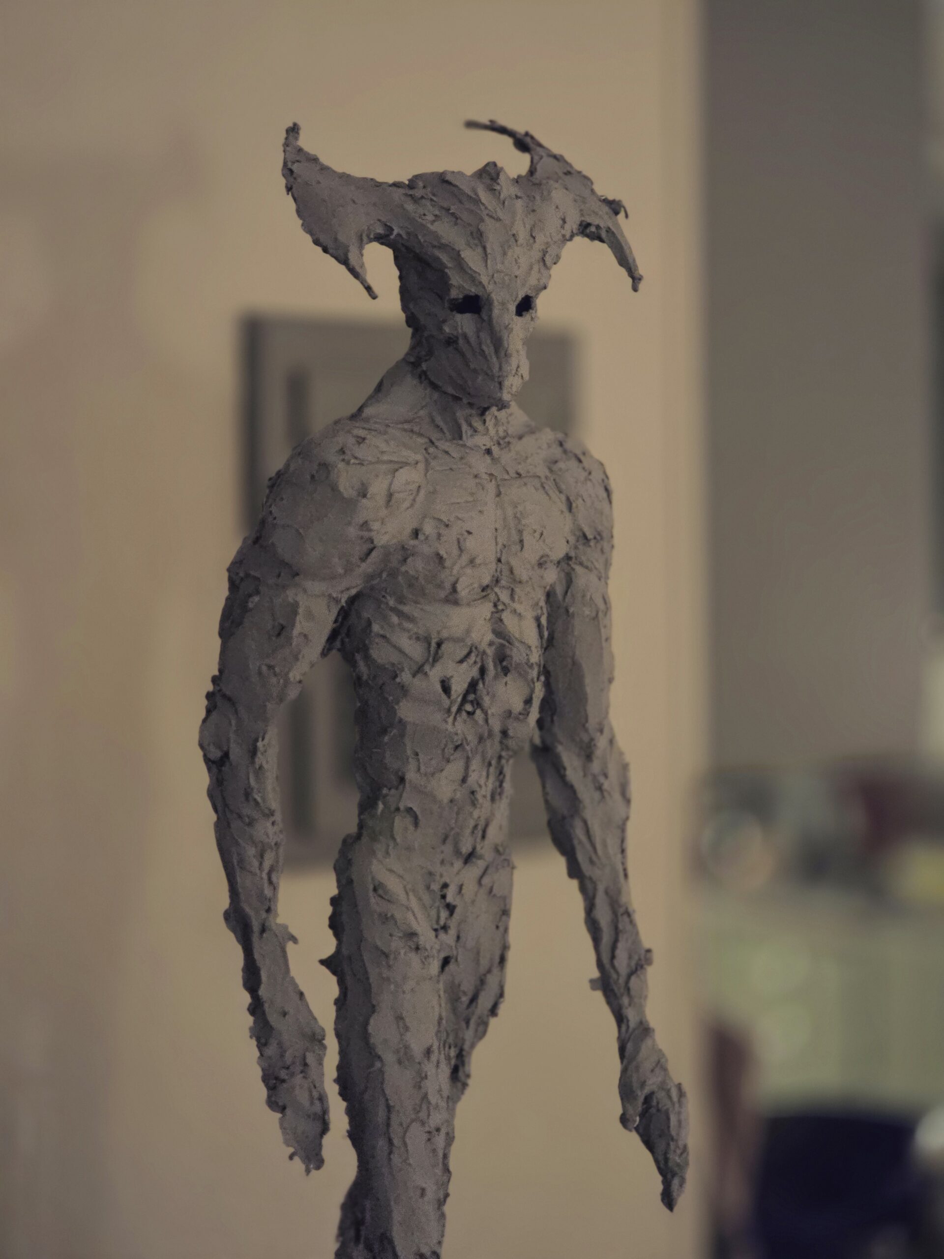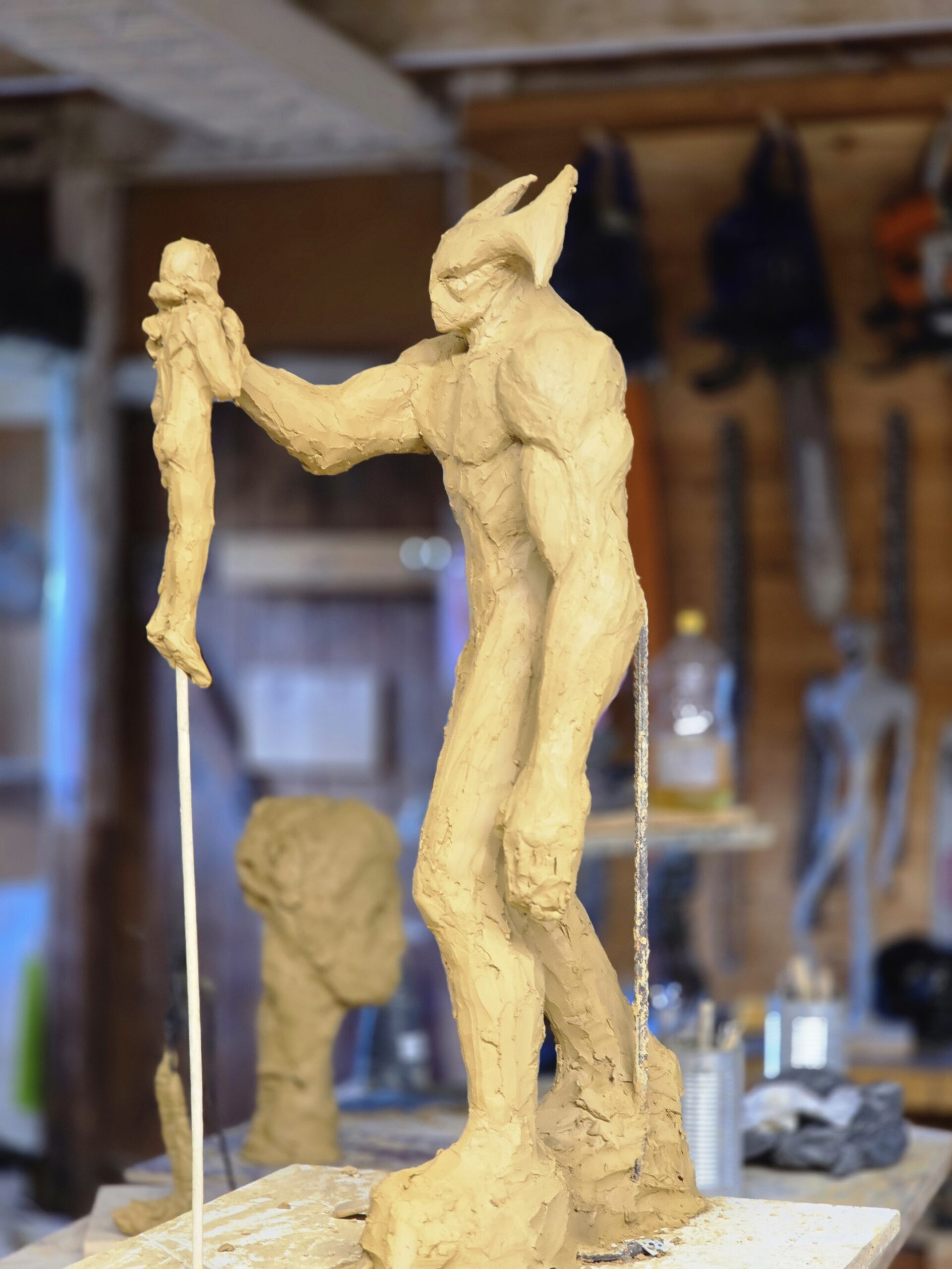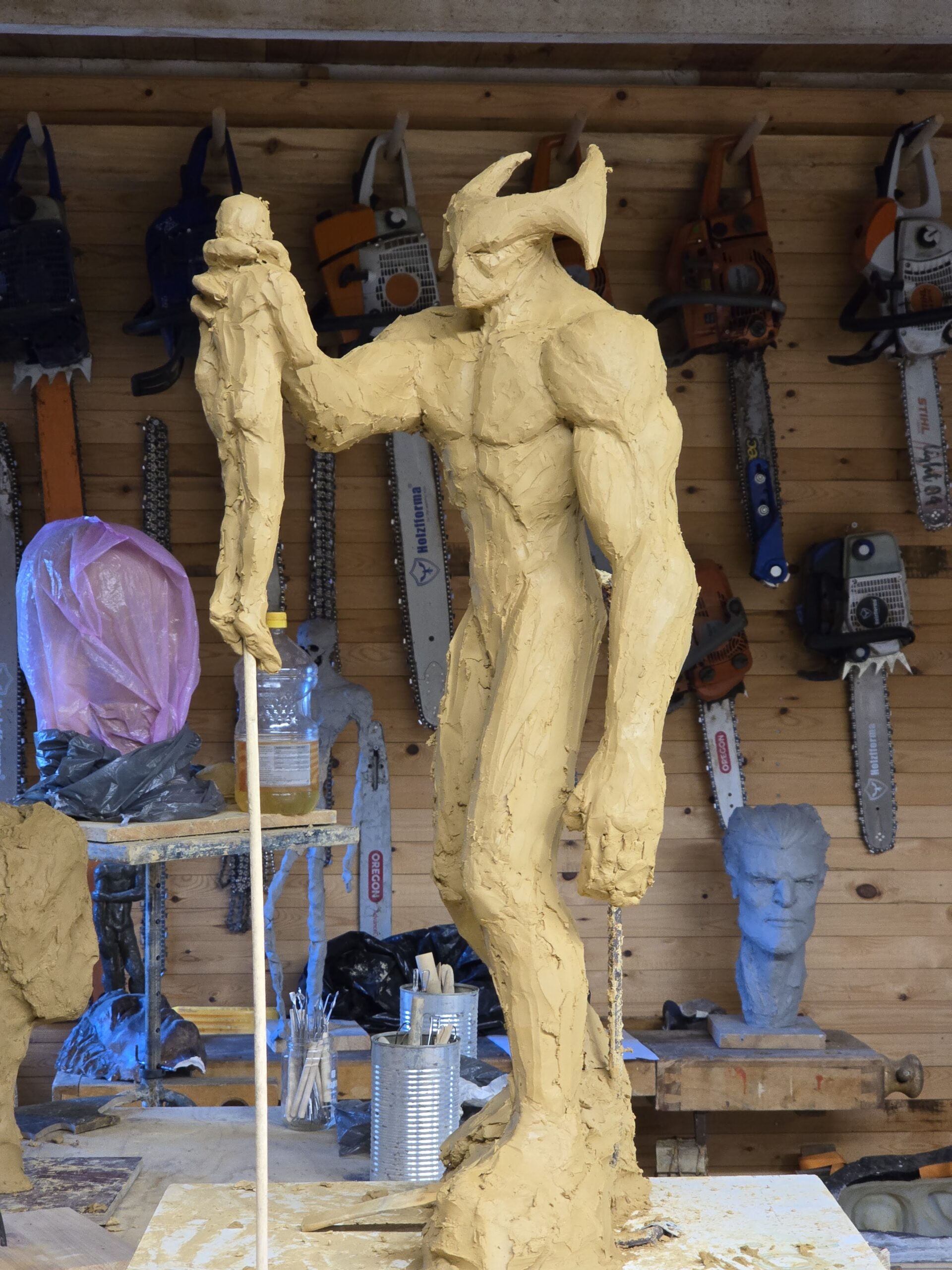 Jag arbetar på mitt andra försök att skapa en skulptur föreställande dödsängeln, Nergal, som var en av de två änglarna som förstörde städerna Sodom och Gomorra. Den första skulpturen är i den ljusa leran. Dock frös den sönder innan jag blev klar. Jag gör ett nytt försök med den mörkgråa leran istället.