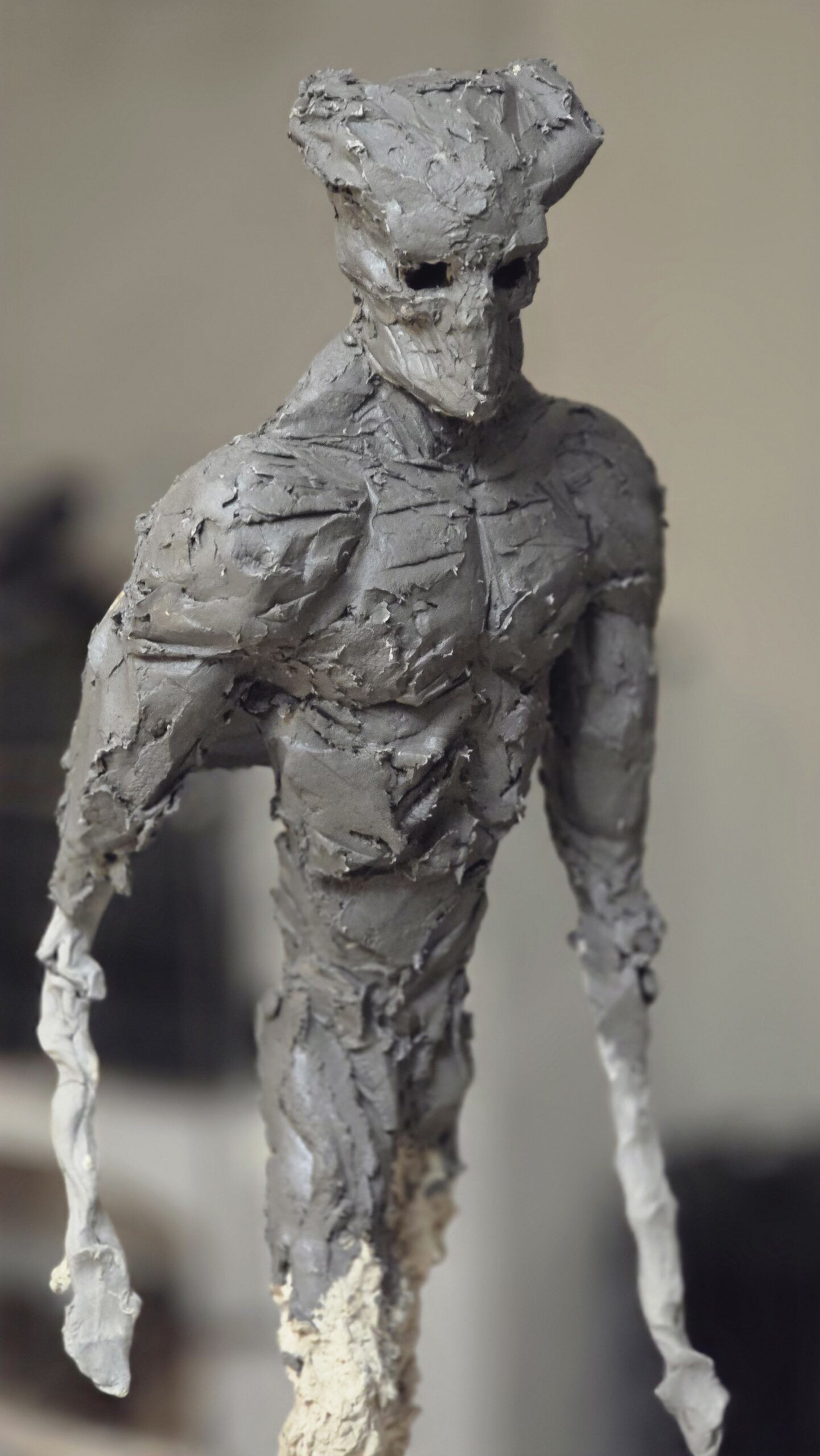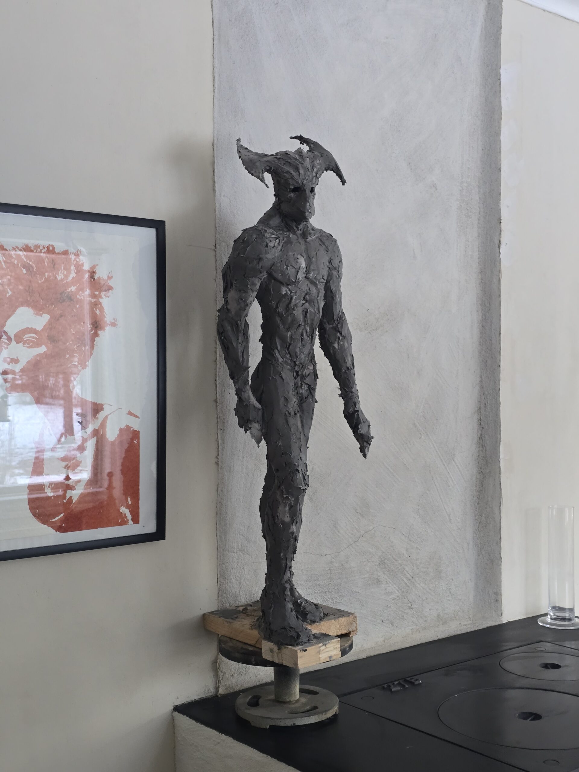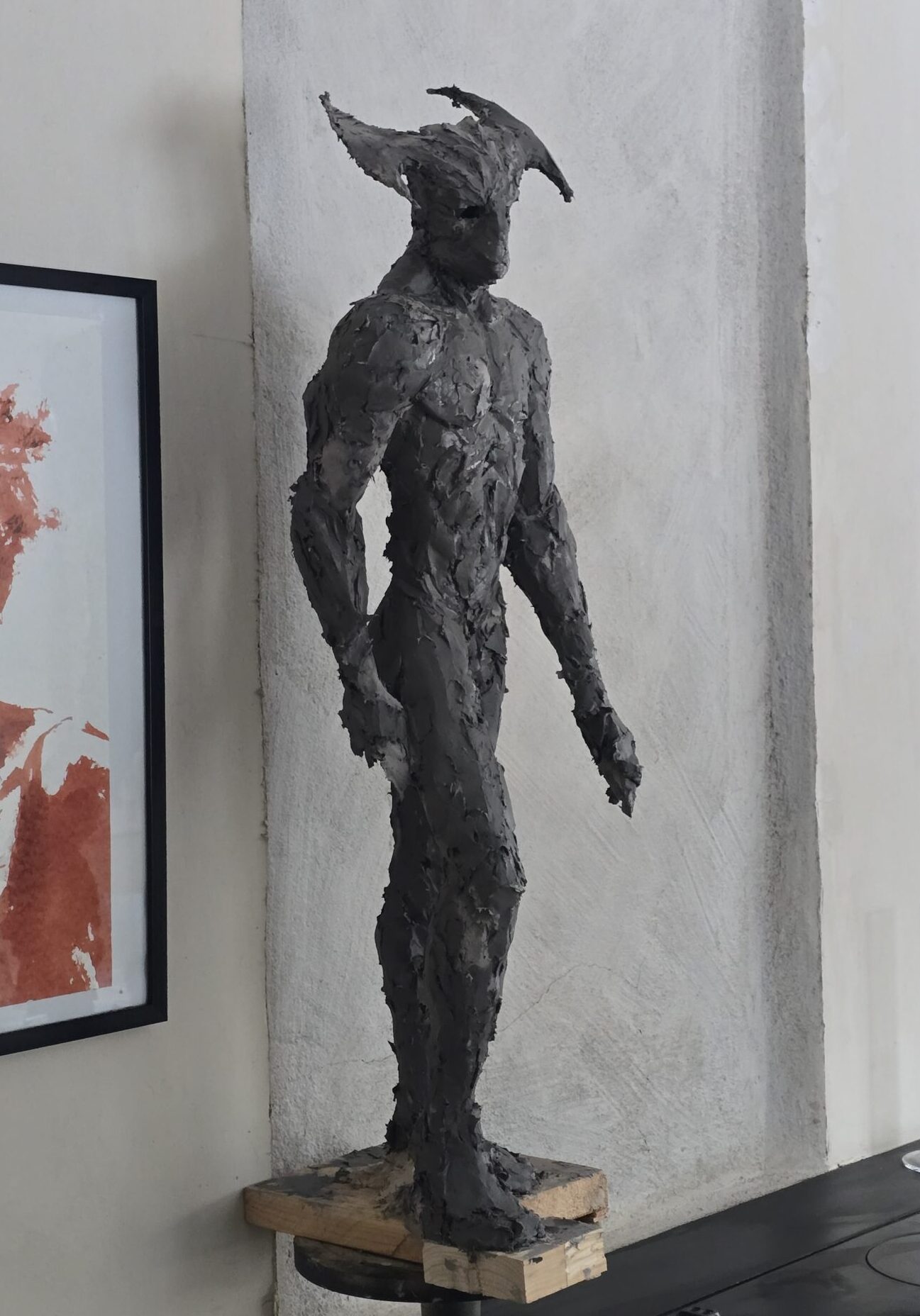 Jag arbetar på mitt andra försök att skapa en skulptur föreställande dödsängeln, Nergal, som var en av de två änglarna som förstörde städerna Sodom och Gomorra. Den första skulpturen är i den ljusa leran. Dock frös den sönder innan jag blev klar. Jag gör ett nytt försök med den mörkgråa leran istället.