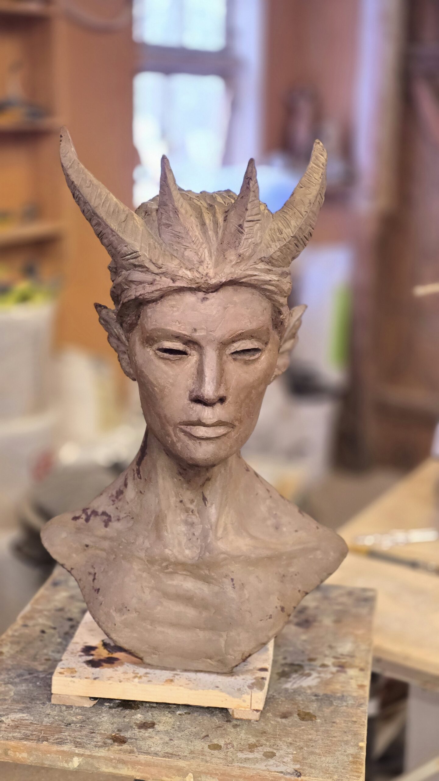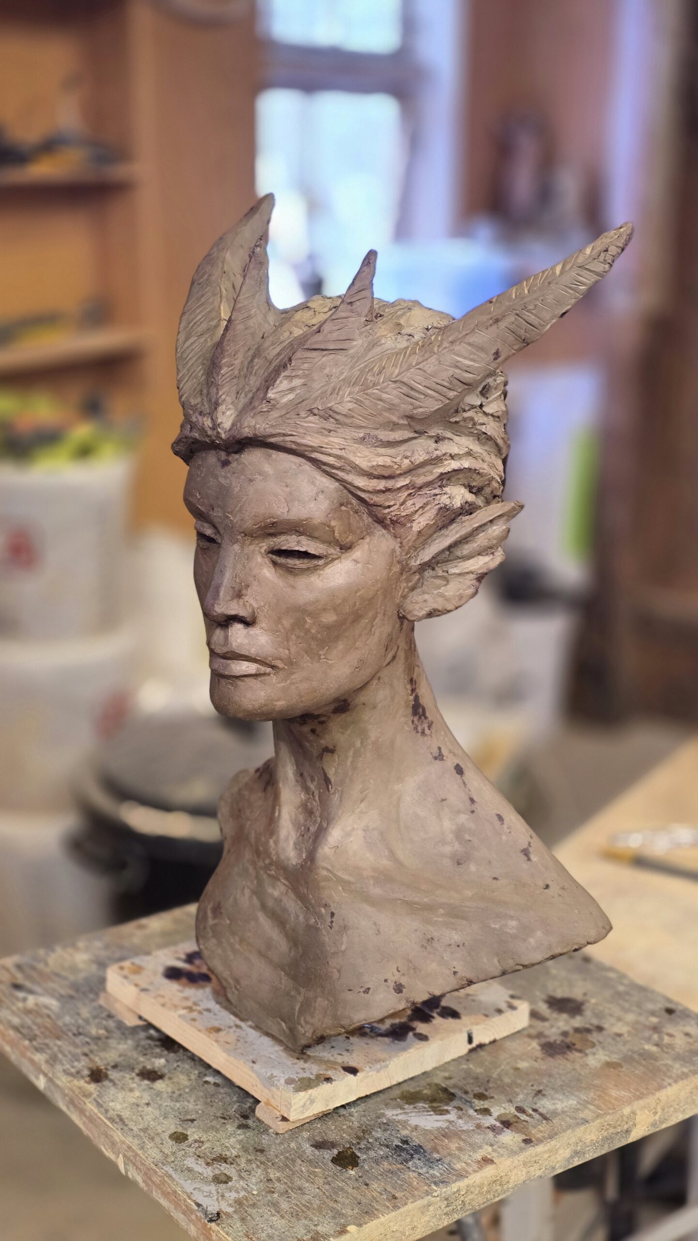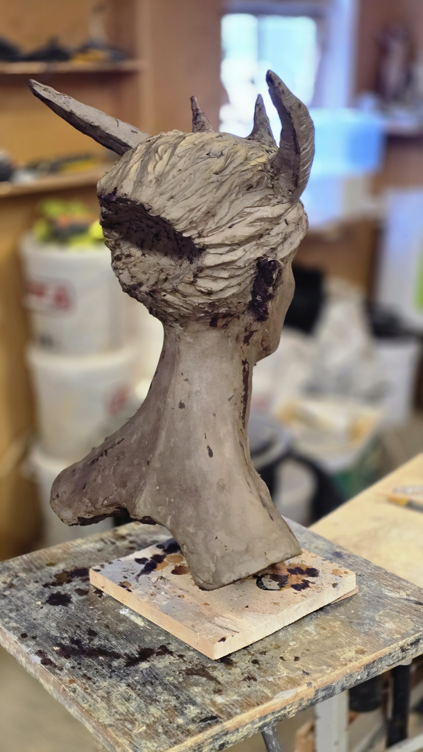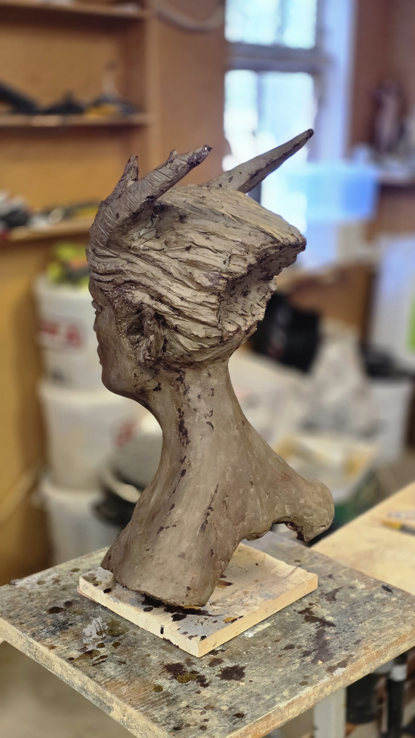Skulpturen Skogsrå är skulpterad i cellulosalera som lufttorkar. Den är ca 60 cm hög. Skulpterad vintern 2025-2026.